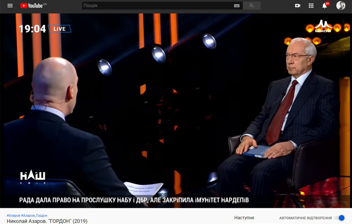 Речь идет о передаче "Гордон" за 5 октября 2019 года, гостем которой был виртуальный Азаров.
