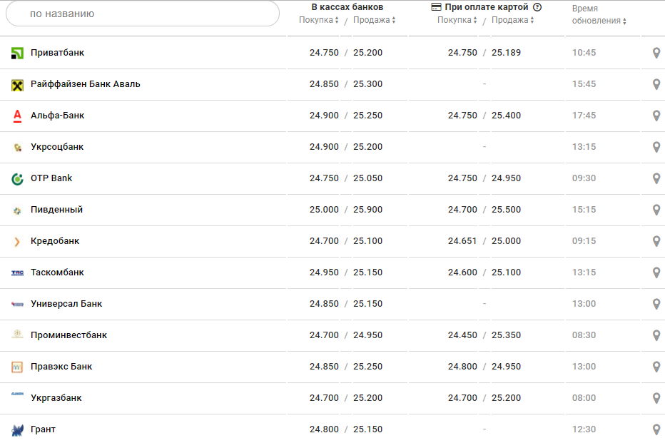 В банках курс доллара с утра был такой: покупка от 24,50 до 24,85 грн, продают от 24,85 до 25,45 грн.