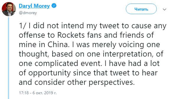 Сам генеральный менеджер "Рокетс" уже принес свои извинения: "Я не хотел, чтобы мой твит как-то обидел фанатов "Рокетс" и моих друзей из Китая. Я едва высказал одну мысль, основанную на одной интерпретации одного запутанного события. После публикации того твита у меня было много возможностей услышать и оценить другие точки зрения", — написал Дэрил Моли в Twitter.