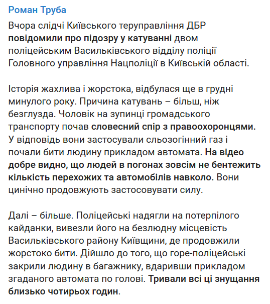 Преступление хотели скрыть, от ответственности уйти. Но не получится. Потому что когда речь идет о нарушении прав человека, унижении его достоинства, причинение ему моральных и физических страданий, реакция может быть только одна - привлечение к ответственности", - написал Роман Труба.