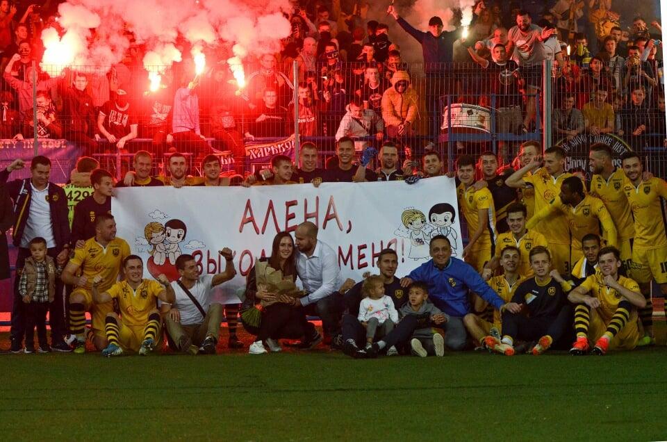 После игры футболисты "Металлиста-1925" подняли баннер с надписью "Алена, выходи за меня". Вместе со спортсменами в футбольном сватании принял участие и главный тренер клуба из Харькова Андрей Демченко.