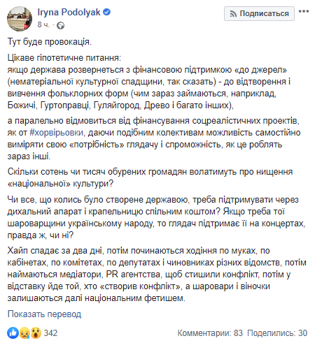 "Интересный гипотетический вопрос: если государство развернется с финансовой поддержкой "к истокам (нематериального культурного наследия, так сказать) - к воспроизведению и изучению фольклорных форм... а параллельно откажется от финансирования соцреалистических проектов, такие как хор Веревки, давая подобным коллективам возможность самостоятельно измерить свою "нужность" зрителю и способность, как это делают сейчас другие. Сколько сотен или тысяч возмущенных граждан кричать об уничтожении "национальной" культуры?" - написала Подоляк.