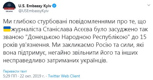 "Мы глубоко обеспокоены сообщениями о том, что украинский журналист Станислав Асеев был осужден так называемой "Донецкой Народной Республикой" до 15 лет заключения. Мы призываем Россию и силы, которые она поддерживает, немедленно освободить его и других несправедливо задержанных украинцев", - пишет посольство.