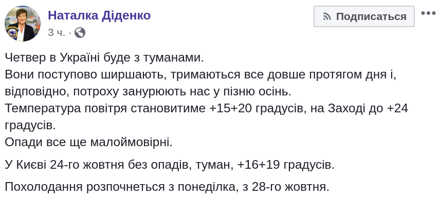 Синоптик Наталья Диденко рассказала, что четверг в Украине будет очень туманным. Об этом она сообщила на своей странице в Facebook.