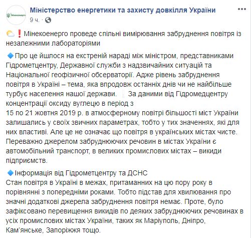 "По данным от Гидромедцентра, концентрации оксида углерода в период с 15 по 21 октября 2019 года в атмосферном воздухе большинства городов Украины оставались в своих привычных параметрах, то есть в тех значениях, которые для них свойственны. Но это не значит что воздух в городах чистый", - пояснили в министерстве.
