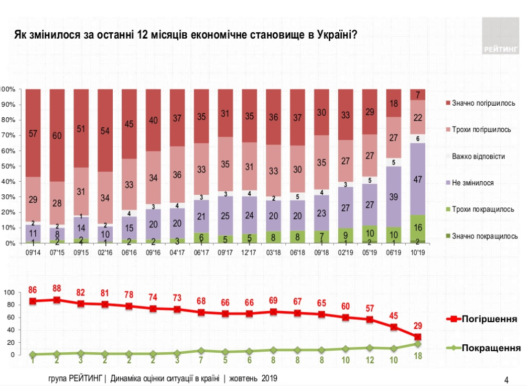 Улучшения в экономическом положении в Украине за последние 12 месяцев увидели 18% украинцев, при этом почти треть населения увидела ухудшение положения. Об этом свидетельствуют результаты опроса социологической группы "Рейтинг".