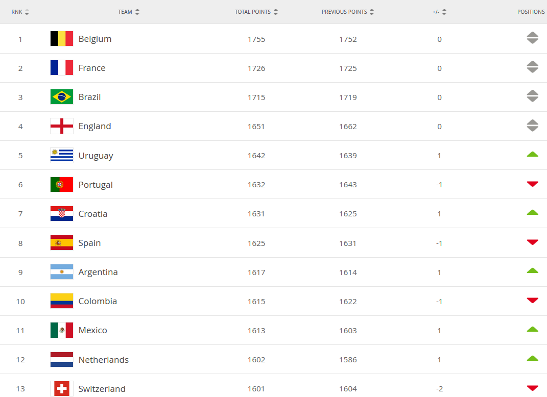 Лидером как и месяц назад остается сборная Бельгии. На втором месте - Франция, на третьем Бразилия, далее идут команды Англии, Уругвая и Португалии.