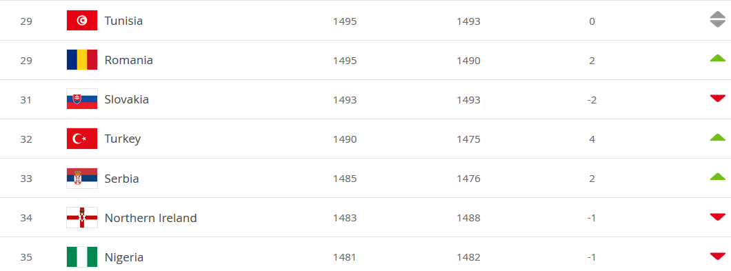 Сборная России поднялась на 37-е место в рейтинге ФИФА. В активе российской команды на сегодняшний день 1474 очка. Ранее команда Черчесова занимала 42-ю строчку, как передает пресс-служба ФИФА.