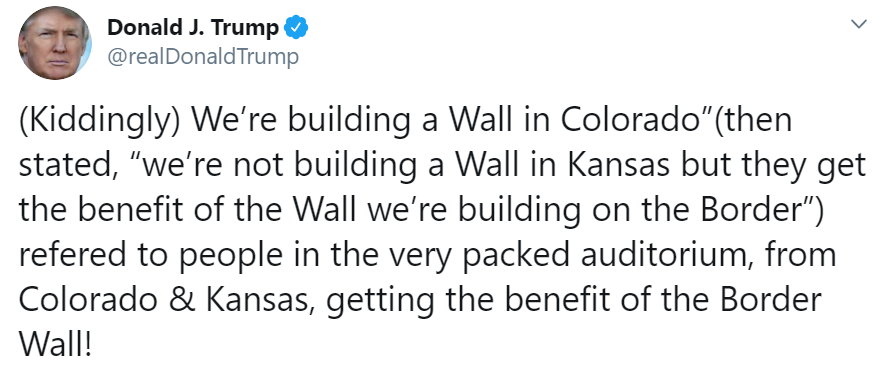 "Мы строим стену на границе Нью-Мексико и мы строим стену в Колорадо. Мы строим красивую стену, большую, которая действительно будет эффективна, которую нельзя перелезть, нельзя обойти", - заявил Трамп во время предвыборного выступления в Питтсбурге. Спустя несколько часов Трамп сам объяснил в твиттере, что он говорил о строительстве стены в Колорадо в шутку (Kiddingly).