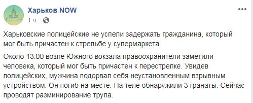 "Около 13:00 возле Южного вокзала правоохранители заметили человека, который мог быть причастен к перестрелке. Увидев полицейских, мужчина подорвал себя неустановленным взрывным устройством. Он погиб на месте. На теле обнаружили 3 гранаты. Сейчас проводят разминирование трупа", - говорится в сообщении.