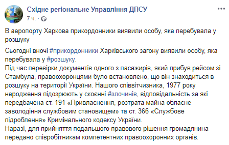 В пятницу, 25 октября, в Международном аэропорту Харькова во время проверки документов пассажиров, которые прилетели из Стамбула, пограничники задержали гражданина Украины 1977 г.р. находящегося в розыске за растрату имущества.