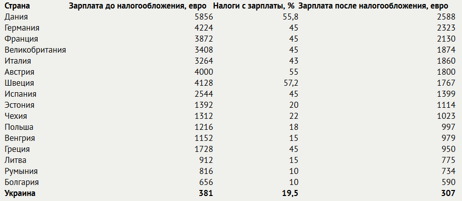 Самая высокая чистая зарплата в Дании - 2588 евро. Следующие в списке Германия (2323 евро) и Франция (2130 евро). Самая низкая зарплата в Украине - 307 евро, на втором месте с конца идет Болгарии (590 евро).