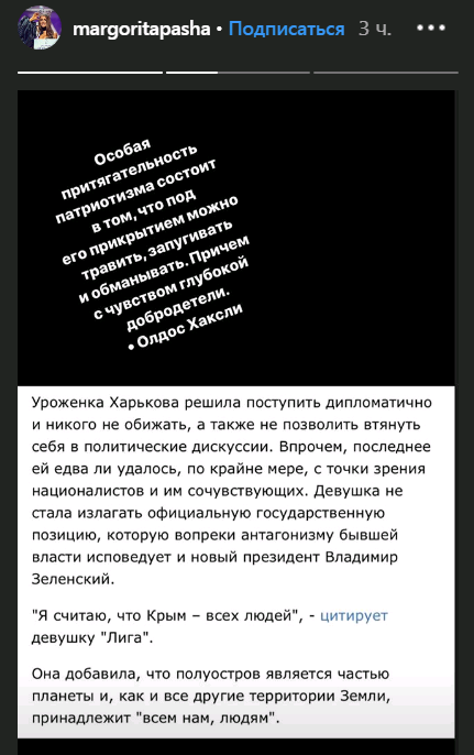 Модель выложила скриншот новости, в которой говорилось, что Паша отказалась отвечать на вопрос о принадлежности полуострова Крым. Паша сопроводила скрин цитатой из интервью Хаксли, написавшего известнейший роман-антиутопию "О дивный новый мир".