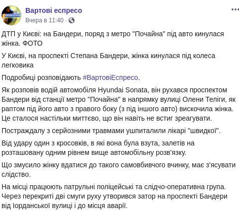 В Киеве на проспекте Степана Бандеры, женщина бросилась под колеса легковушки. Об этом в Facebook сообщила группа Вартові еспресо.
