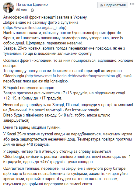 "Атмосферный фронт наконец пришел в Украину... Фронт, как и положено почтенному атмосферному образованию, несет с собой дожди. Правда, в основном небольшие. Завтра, 29 октября, влажная погода будет преобладать повсеместно, если не с туманами, то с дождевыми остатками фронта. Поскольку фронт - холодный, то за ним распространяется, соответственно, холодный воздух. Теплую погоду постепенно будет вытеснять с нашей территории антициклон Oldenburgia, который находится пока только под Исландией", - написала Наталья Диденко.