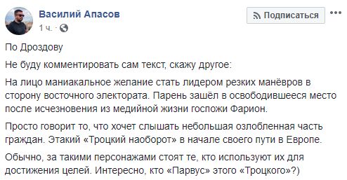 Журналист Василий Апасов проводит историческую параллель: "По Дроздову. Не буду комментировать сам текст, скажу другое: Налицо маниакальное желание стать лидером резких манёвров в сторону восточного электората. Парень зашёл в освободившееся место после исчезновения из медийной жизни госпожи Фарион.