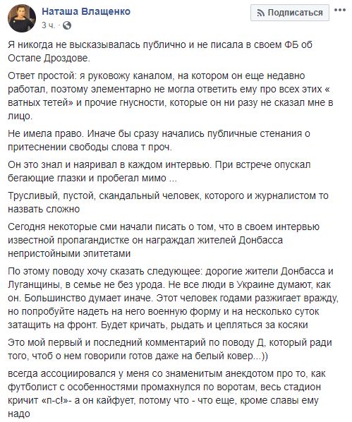 "Я никогда не высказывалась публично и не писала в своем ФБ об Остапе Дроздове. Ответ простой: я руковожу каналом, на котором он еще недавно работал, поэтому элементарно не могла ответить ему про всех этих "ватных тетей" и прочие гнусности, которые он ни разу не сказал мне в лицо. Не имела право. Иначе бы сразу начались публичные стенания о притеснении свободы слова и проч. Он это знал и наяривал в каждом интервью. При встрече опускал бегающие глазки и пробегал мимо... Трусливый, пустой, скандальный человек, которого и журналистом то назвать сложно.
