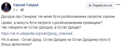 Политтехнолог Сергей Гайдай припомнил Дроздову его критику Олега Сенцова за русскоязычную речь: "Дроздов про Сенцова. Не может быть русскоговорящими патриот Украины. Интересно, а могут быть патриоты с русскоговорящим фамилией? Время говорить не Остап Дроздов, а Остап Дриздив?