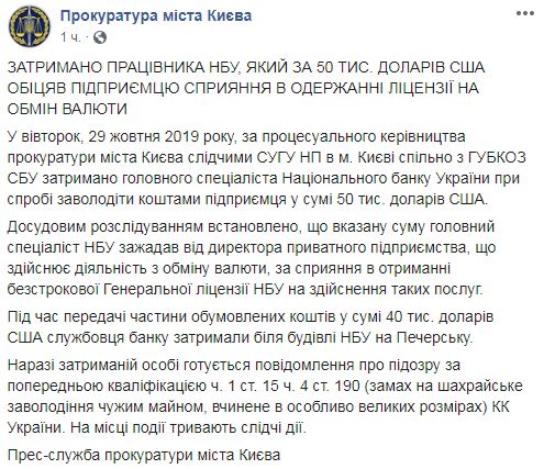 Досудебным расследованием установлено, что указанную сумму главный специалист НБУ потребовал от директора частного предприятия, осуществляющего деятельность по обмену валюты, за содействие в получении бессрочной Генеральной лицензии НБУ на осуществление таких услуг, сообщили в прокуратуре.