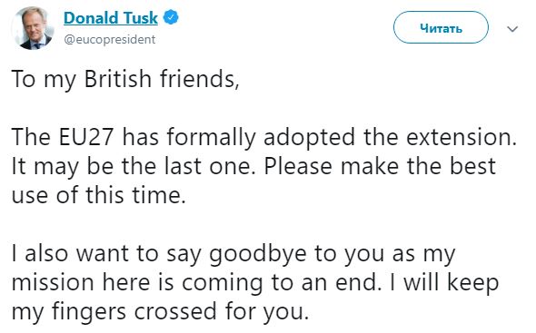 "Моим британским друзьям: 27 стран ЕС официально одобрили отсрочку. Возможно, это последняя отсрочка. Пожалуйста, используйте это время с пользой. Я также хочу попрощаться с вами, поскольку моя миссия здесь заканчивается. Я буду держать кулаки за вас", - написал Туск.