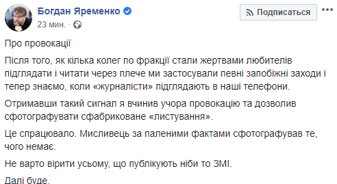 Получив такой сигнал, я совершил вчера провокацию и позволил сфотографировать сфабрикованную "переписку". Это сработало. Охотник за жжеными фактами сфотографировал то, чего нет. Не стоит верить всему, что публикуют якобы СМИ. Продолжение следует", – написал нардеп.