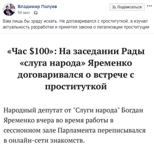 "Вам лишь бы зраду искать. Не договаривался с проституткой, а изучал актуальность разработки и принятия закона о легализации проституции", – предположил журналист Владимир Полуев.