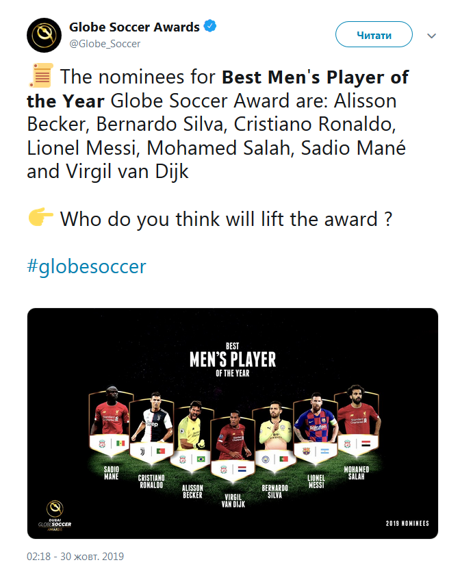 Об этом сообщает официальный Twitter The Globe Soccer Awards.