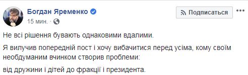 "Я удалил предыдущий пост и хочу извиниться перед всеми, кому своим необдуманным поступком создал проблемы: от жены и детей до фракции и президента", - также добавил Яременко.