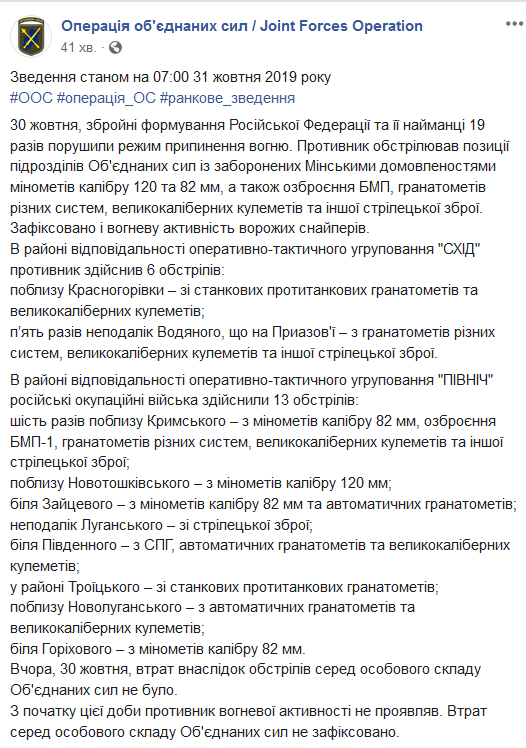"30 октября, вооруженные формирования Российской Федерации и ее наемники 19 раз нарушили режим прекращения огня. Противник обстреливал позиции подразделений Объединенных сил из запрещенных минского договоренностями минометов калибра 120 и 82 мм, а также вооружения БМП, гранатометов различных систем, крупнокалиберных пулеметов и другого стрелкового оружия. Зафиксирована и огневая активность вражеских снайперов.