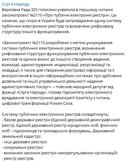 "Законопроект №2110 разработан с целью упорядочения системы публичных электронных реестров, определение унифицированной структуры функционирования публичных электронных реестров и единых требований к их созданию, ведению, взаимодействия, администрирования, модернизации, реорганизации и ликвидации. А также для создания реестровой информации и ее использования в других информационных системах при осуществлении разрешительной и иной управленческой деятельности предоставление административных услуг", – пояснил народный депутат от фракции "Слуга Народа", председатель подкомитета электронного управления и электронной демократии Комитета по вопросам цифровой трансформации Роман Соха.