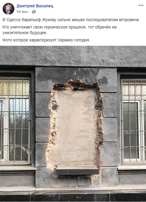"В Одессе барельеф Жукову сильно мешал последователям Вятровича. Кто уничтожает свою героическое прошлое, тот обречён на унизительное будущее. Фото которое характеризует Украину сегодня..." - написал Василец.