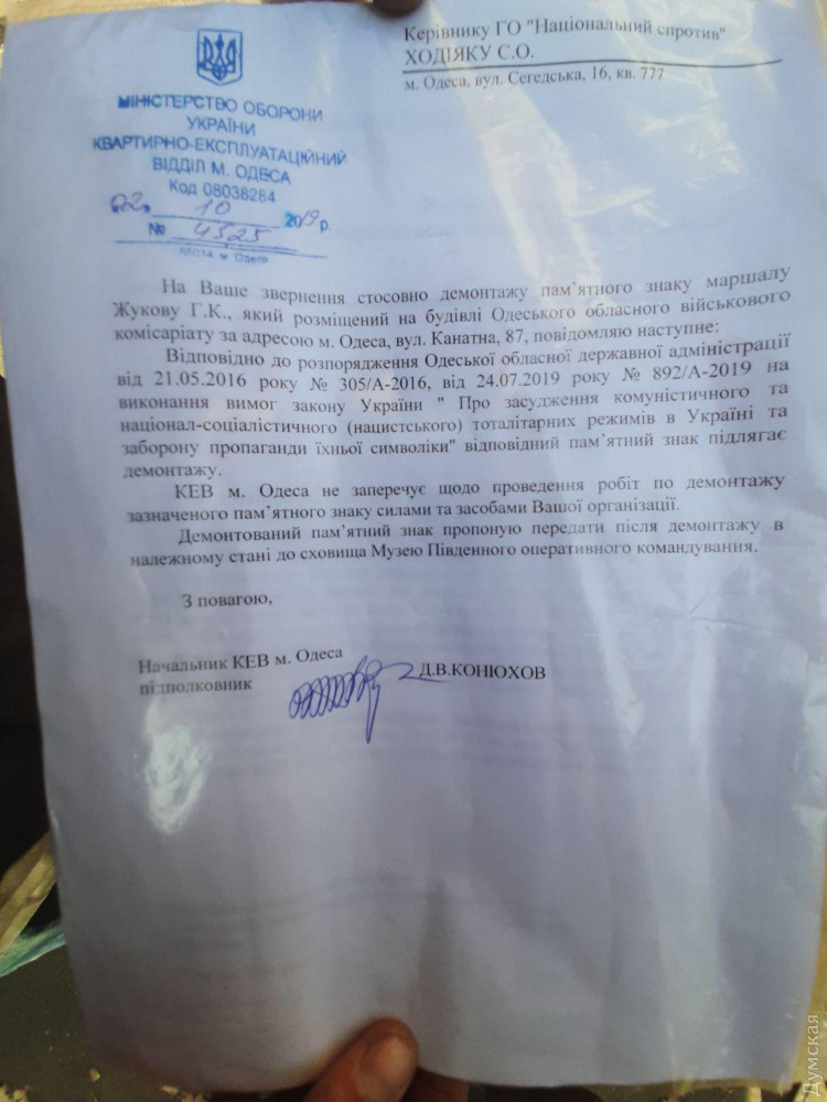 Люди, убиравшие барельеф со здания, предъявили журналистам документ, выданный начальником квартирно-эксплуатационного отдела Министерства обороны Украины. В тексте сказано, что отдел не возражает против демонтажа памятного знака. Ведь последний подпадает под закон о декоммунизации, поскольку Жуков был членом президиума ЦК КПСС и министром обороны Советского Союза.