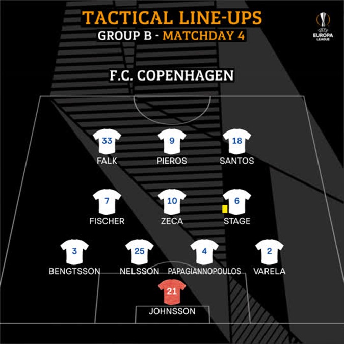 Копенгаген: Юнссон - защитники - Варела, Папаяннопулос, Нельссон, Бенгтссон - полузащитники - Стаге, Зека, Фишер - атака - Сантос, Сотириу, Фальк.