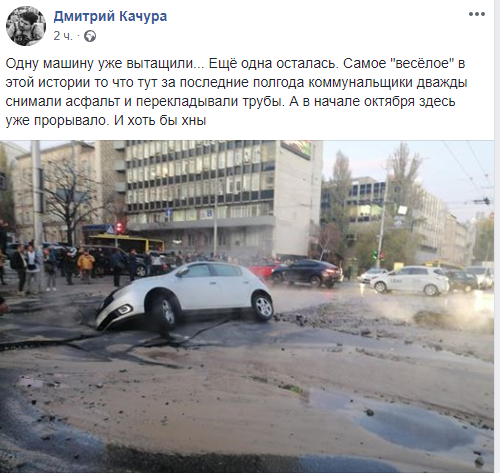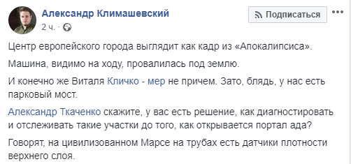 "Центр европейского города выглядит, как кадр из "Апокалипсиса". Машина, видимо, на ходу, провалилась под землю. И, конечно же, Виталя Кличко – мэр ни при чем. Зато, б@, у нас есть парковый мост.