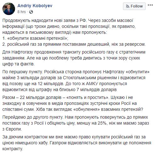 Россия предлагает Украине обнулить претензии на общую сумму 22 миллиарда долларов. Об этом в Facebook написал глава "Нафтогаза" Андрей Коболев.