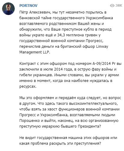 "Петр Алексеевич, мы тут незаметно порылись в банковской тайне государственного Укрэксимбанка, возглавляемого родственником Вашей жены, и обнаружили, что Ваше преступное кубло в период войны украло еще и 34,3 миллиона гривен у государственной военной компании Прогресс, перечислив деньги на британский офшор Linway Management LLP.
