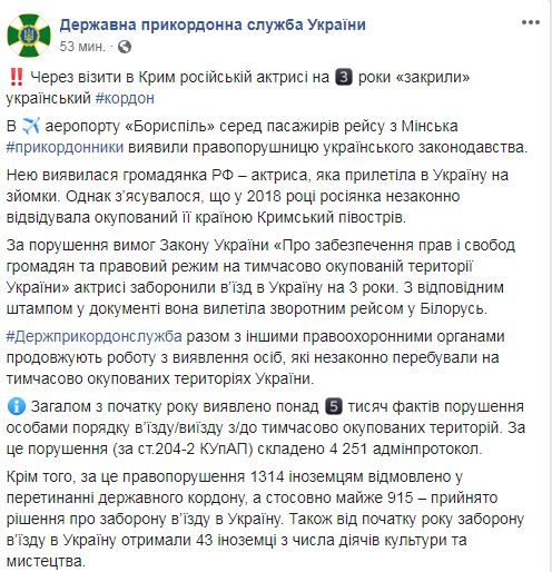 "В аэропорту "Борисполь" среди пассажиров рейса из Минска пограничники выявили правонарушительницу украинского законодательства. Ею оказалась гражданка РФ - актриса, прилетевшая в Украину на съемки. Однако выяснилось, что в 2018 году россиянка незаконно посещала оккупированный ее страной Крымский полуостров", - говорится в сообщении.