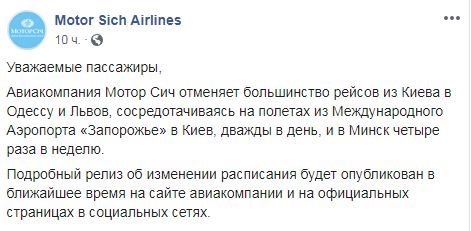 Авиакомпания "Мотор Сич" отменяет большинство рейсов из Киева в Одессу и Львов, сосредотачиваясь на полетах из Запорожья в Киев и в Минск (Республика Беларусь). Об этом свидетельствует информация на странице авиакомпании в Facebook.
