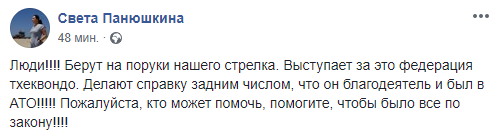 "Люди!!!! Берут на поруки нашего стрелка. Выступает за это федерация тхеквондо. Делают справку задним числом, что он благодеятель и был в АТО!!!!! Пожалуйста, кто может помочь, помогите, чтобы было все по закону!!!!" - написала соседка стрелявшего.