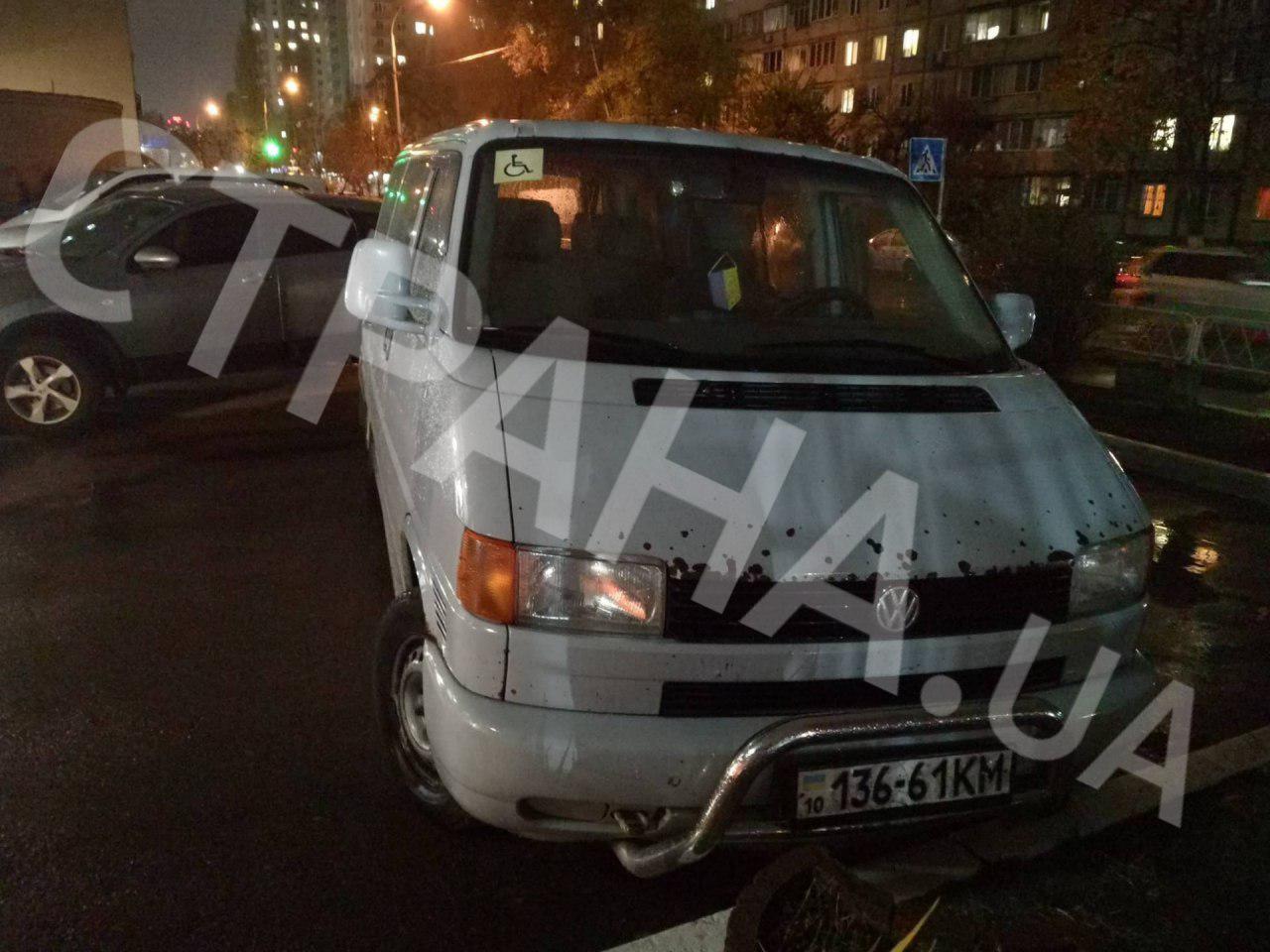 Жители дома рассказали, что недавно у автомобиля Алексея кто-то ночью пробил колесо. И действительно, левое заднее колесо на машине оказалось спущено. Машину "святошинского стрелка" узнать легко: это белый "бусик" со значком "инвалид".