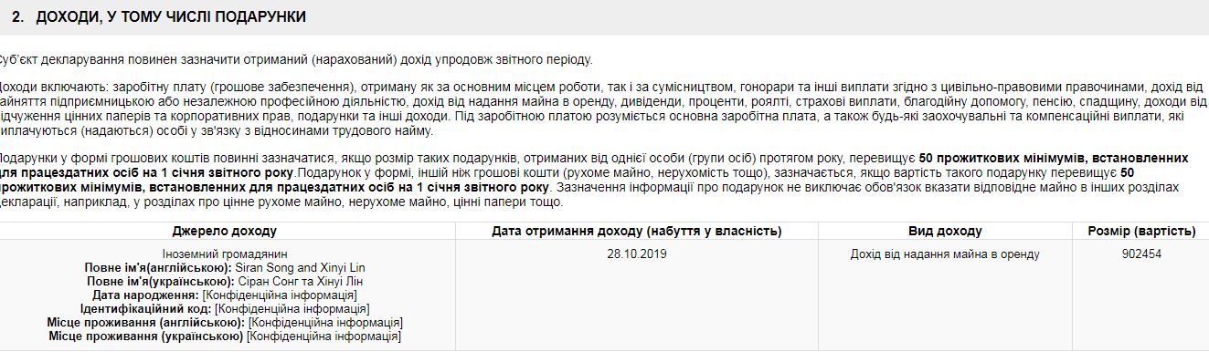 Существенные изменения в имущественном состоянии задекларированы Зеленским 6 ноября. Согласно декларации, 28 октября президент получил 902 454 гривни дохода от предоставления в аренду имущества (какого именно – не указано) иностранным гражданам Сиран Сонг и Хинуи Лин.