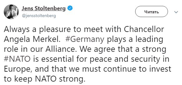 "Всегда приятно встретиться с канцлером Ангелой Меркель. Германия играет ведущую роль в нашем альянсе. Мы согласны с тем, что сильный НАТО необходим для мира и безопасности в Европе, и что мы должны продолжать инвестировать, чтобы сохранить НАТО сильным", — написал он в Twitter.
