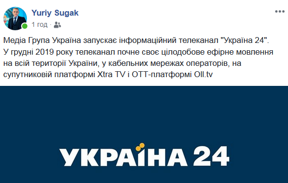 "Медиа Группа Украина запускает информационный телеканал "Украина 24". В декабря 2019 года телеканал начнет свое круглосуточное эфирное вещание на всей территории Украины, в кабельных сетях операторов, на спутниковой платформе Xtra TV и ОТТ-платформе Oll.tv", - говорится в сообщении Юрия Сугака.