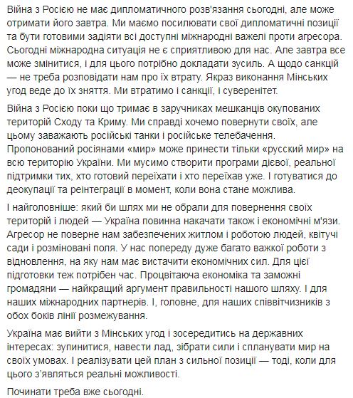 "Украина должна выйти из Минских соглашений и сосредоточиться на государственных интересах: остановиться, навести порядок, собрать силы и спланировать мир на своих условиях. И реализовать этот план с сильной позиции - тогда, когда для этого появятся реальные возможности", - говорится в заявлении.