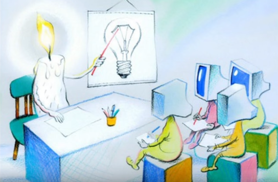На экране был представлен также слайд, где ученики с компьютерами вместо голов слушают преподавателя. Учитель изображен в виде тлеющей свечи и рассказывает о строении электрической лампы.