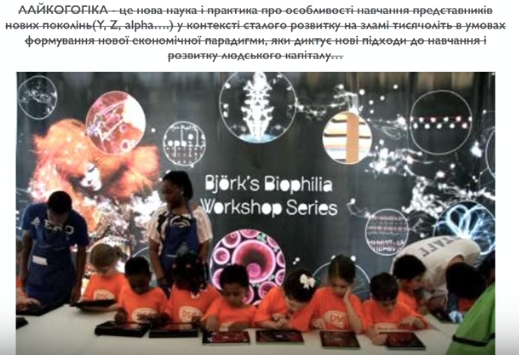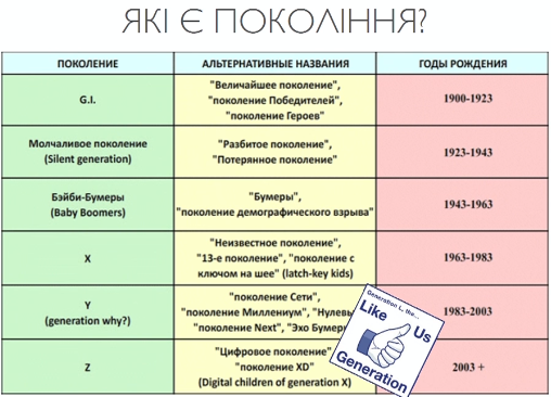 Также Корниенко предлагает "погружаться в тему" лайкогогики, посредством разграничения типов поколений. Так, он акцентирует внимание на последних двух типах - так называемом generation why "Y" и "Z", которые сильно связаны с Интернетом и развитием технологий. "Мы являемся или их представителями или это наши дети", - говорит автор тренинга.