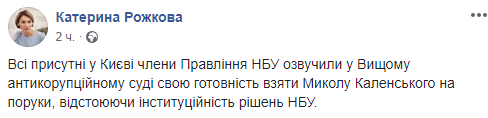Позже она обнародовала и видео из зала суда, где повторила, что все присутствующие в Киеве члены правления НБУ озвучили в Высшем антикоррупционном суде свою готовность взять на поруки Николая Каленского.