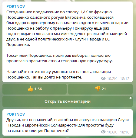 "Сегодняшнее продвижение по списку ЦИК во фракцию Порошенко одиозного рогуля Вятровича, состоявшееся благодаря подковерному назначению одного из членов партии Порошенко на работу к премьеру Гончаруку ещё раз подтверждает слова, что мы имеем дело с реальной коалицией двух, а не одной политических сил - "Слуги Народа" и ЕС Порошенко", - написал Портнов на своем телеграм-канале.