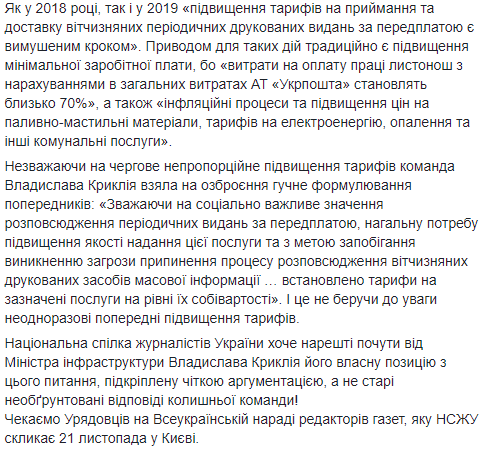 "10 сентября 2019 года Национальный союз журналистов Украины обратился с официальным письмом к новоназначенному министру инфраструктуры Владиславу Криклию по вопросу повышения цен на почтовую доставку газет, которую пытался ввести национальный оператор почтовой связи АО "Укрпочта". В этом письме мы призвали господина министра встать на защиту украинских газет и их аудитории и не вводить в действие приказ "Об утверждении тарифов на прием и доставку отечественных периодических печатных изданий по подписке".