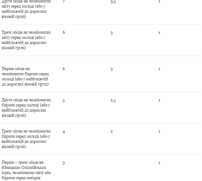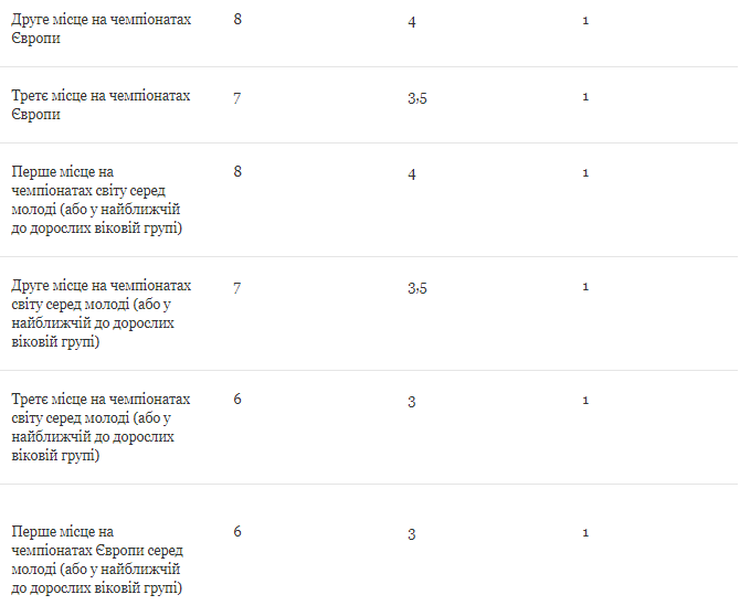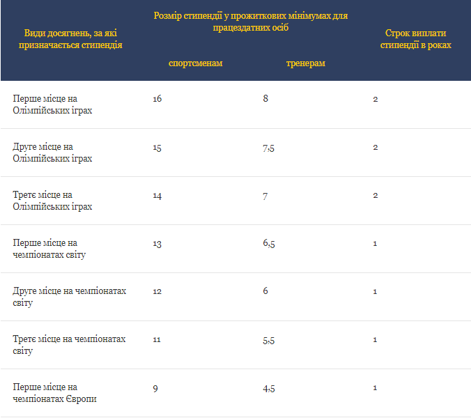 Таким образом, согласно указу, олимпийский чемпион, который занял первое место, в течение двух лет будет получить стипендию в размере 16 прожиточных минимумах для трудоспособных лиц (размер прожиточного минимума с 1 декабря - 2027 грн - Ред.), то есть 32 423 грн в месяц. Спортсмену, занявшему второе место на Олимпийских играх, будут выплачивать 15 прожиточных минимумов в течение двух лет или 30 405 грн ежемесячно. Меньше всех будут платить призерам Юношеских Олимпийских игр, чемпионатов мира или Европы среди юниоров - 3 прожиточных минимума в течение года или 6081 грн.